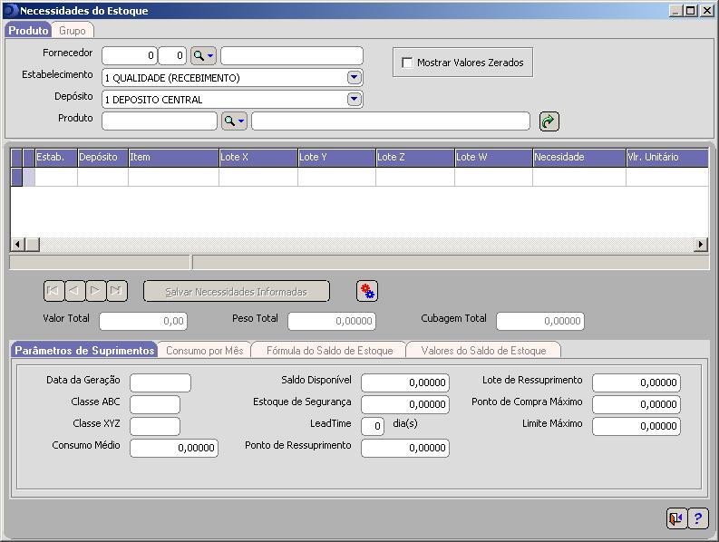 - Mostrar Valores Zerados: Exibe os itens de estoque que possuem a necessidade sugerida com valor zero.