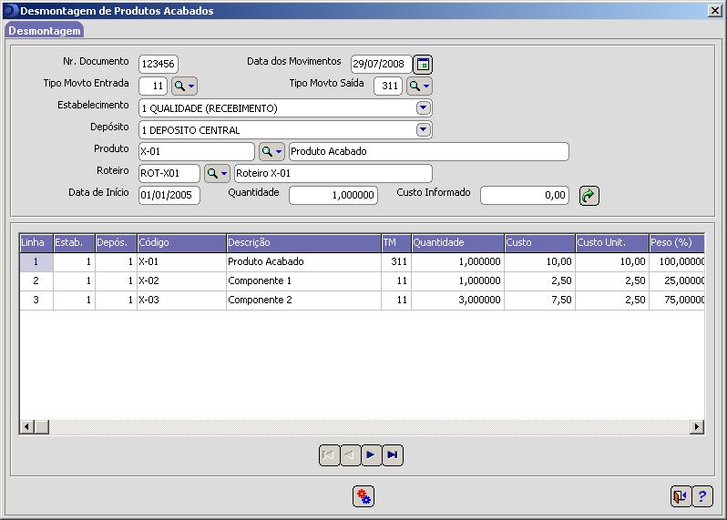 A desmontagem de produto acabado gera uma movimentação de saída do produto acabado, com base na quantidade e custos envolvidos, e as movimentações de entrada dos componentes, baseado no roteiro de fabricação, com as respectivas quantidades e custos.