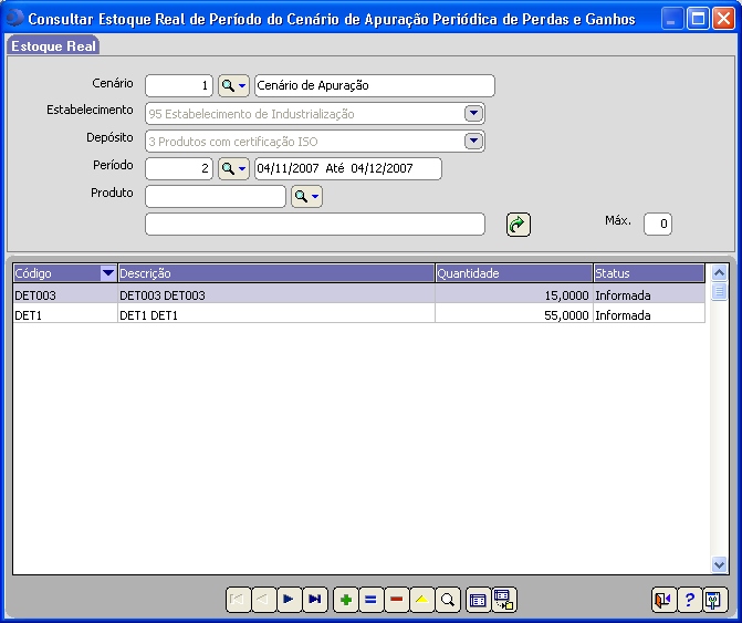 Essa Janela permite a consulta de Estoque Real de Período do Cenário de Apuração Periódica e efetuar manutenção como Incluir, Alterar, Copiar, Consultar e Excluir.